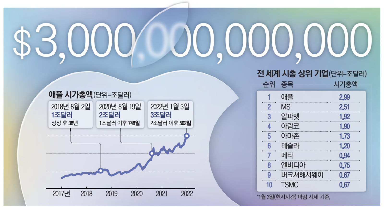 아이폰만큼이나 잘 팔린 웨어러블 덕분에 전 세계 시가총액 1위 기업인 애플의 주가가 이틀 연속 사상 최고가를 경신하며 시가총액 ‘3조 달러’를 눈앞에 두고 있다.