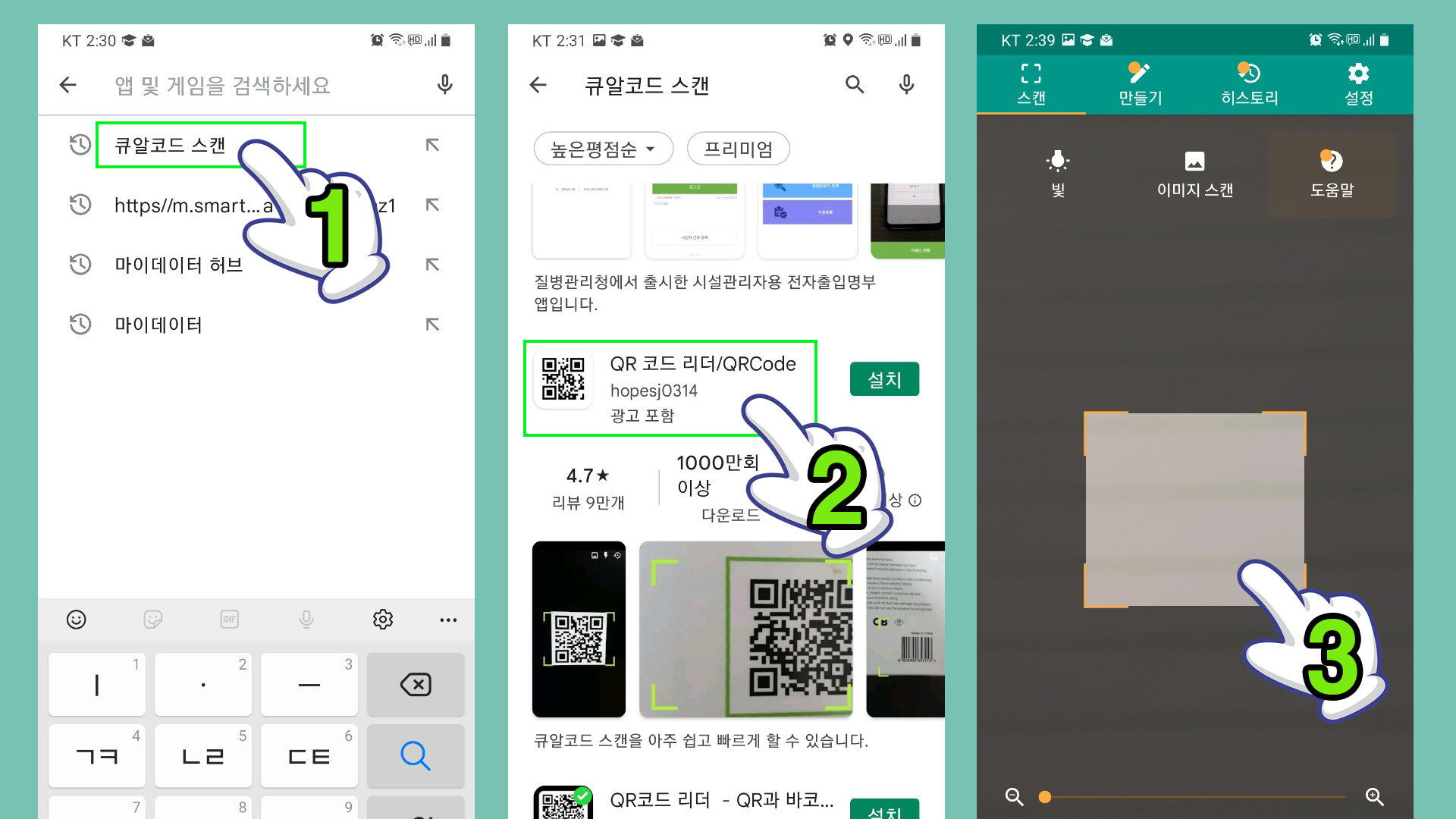구글 플레이에서 큐알 이라고만 검색창에 치시면 QR코드 스켄 보입니다 → 클릭 → 어플이 많이 나오는데 그중에서 QR코드 리더를 설치하세요 (광고가 없어서 편함)