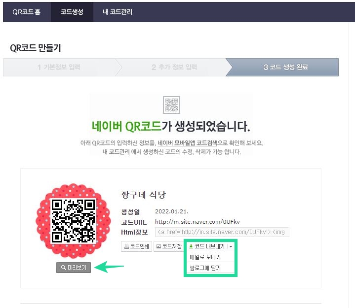 마지막 3단계 QR코드 완성되었습니다. 미리보기를 확인해 보시면 링크한 곳이 보이게 되며 기타의 내용을 미리 봇루있습니다.