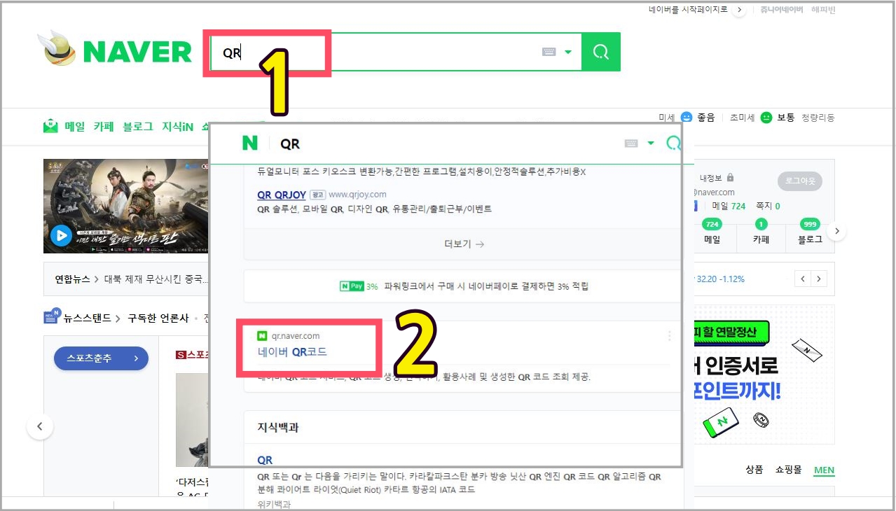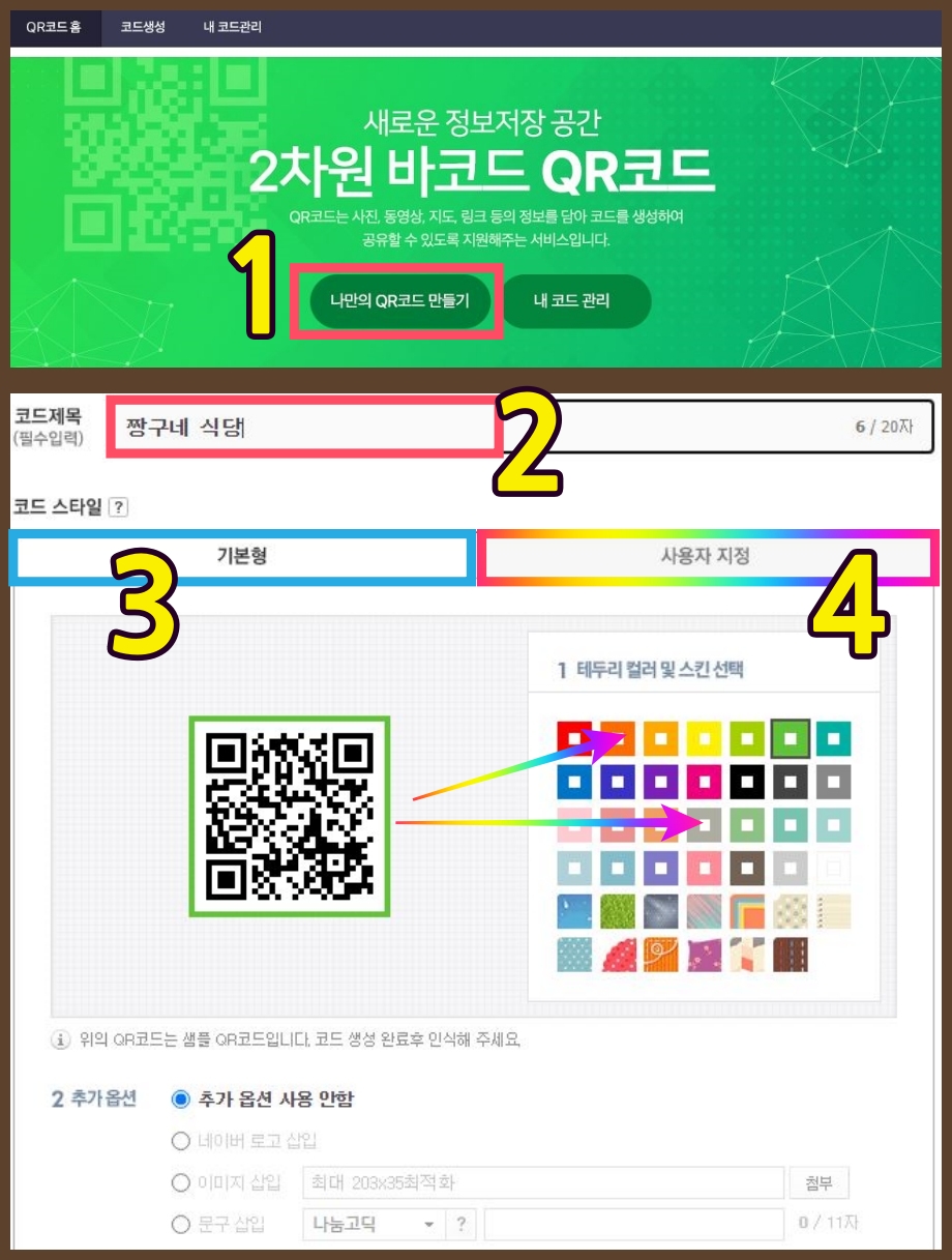 2번과 같이 선택 하시면 네이버가 제공해주는 QR코드는 나만의 QR코드를 쉽게 만들 수 있습니다. 로그인은 하셔야 해요