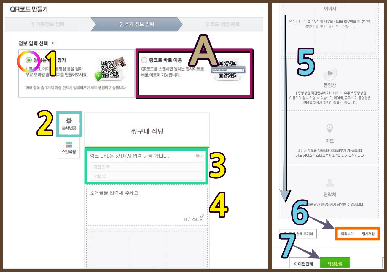 2단계에서는 1번과 같이 원하는 정보 담기를 체크 → 2 작업한 순서를 바꿔줄 수 있으며 → 3 사이트 URL 주소를 넣어줄 수 있으며 → 4.식당 소개 → 5 식당 사진, 동영상 이나 약도등을 넣어줄수 있게 됩니다.