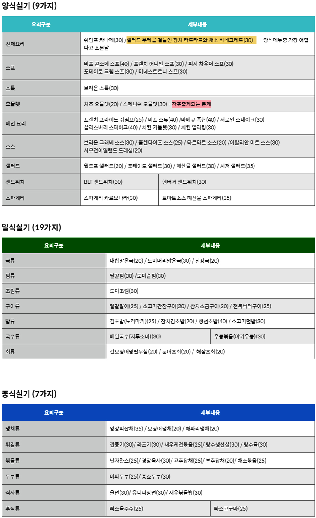 각 응시하는 종류에 따라 기본 요리가 정해져 있으며 그중에서 랜덤으로 출제가 된다.