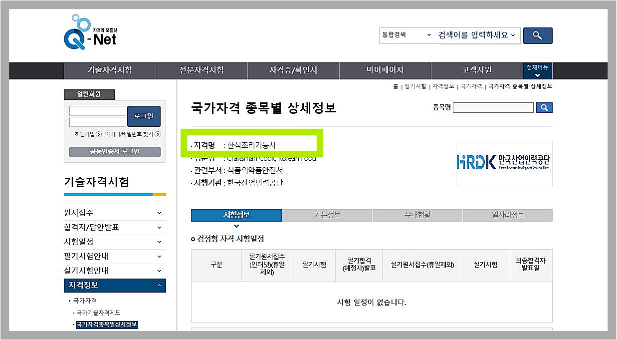 시험일정은 Q넷으로 방문해 검색창에서 해당 요리사 시험 내용을 검색하고