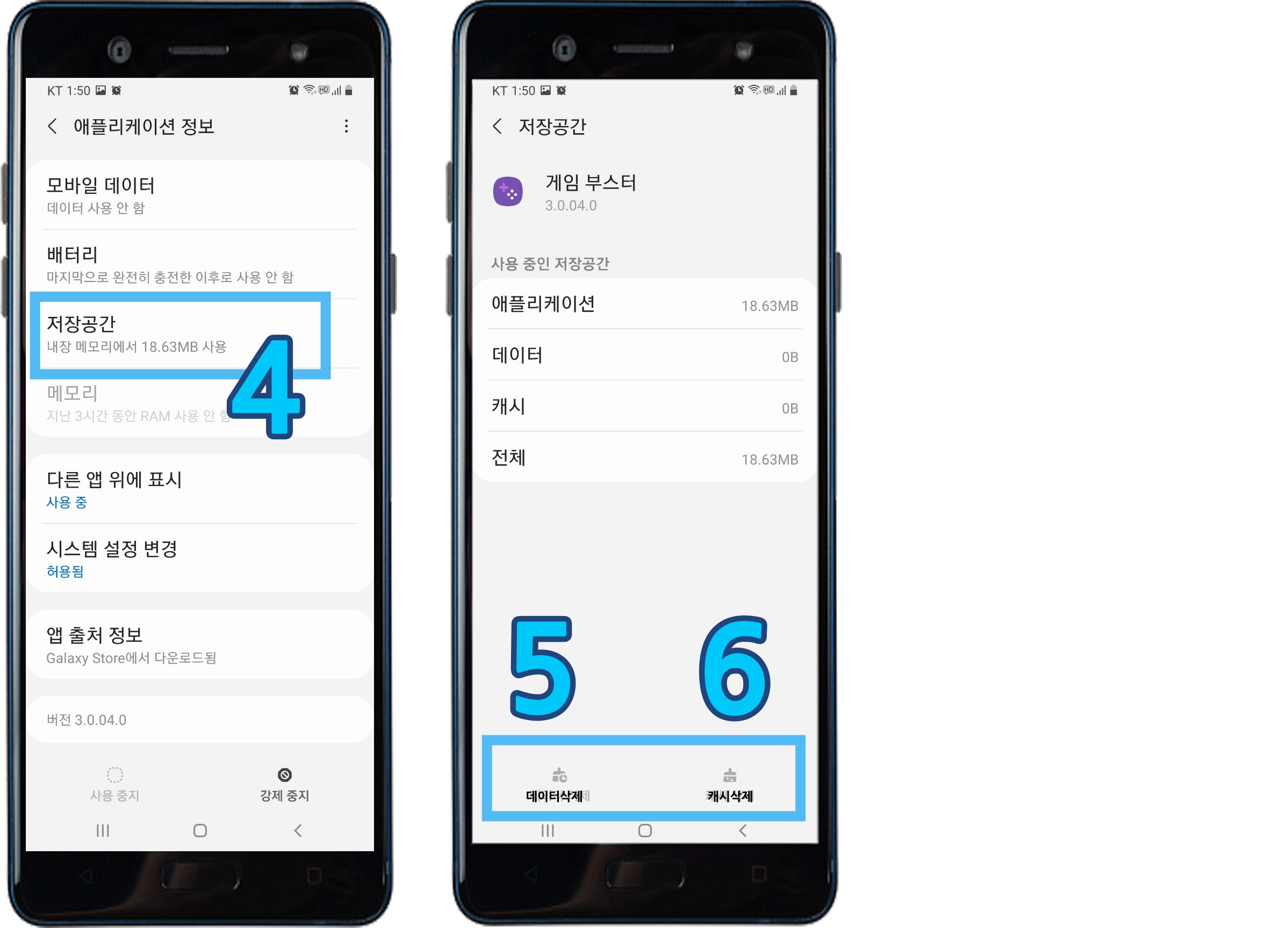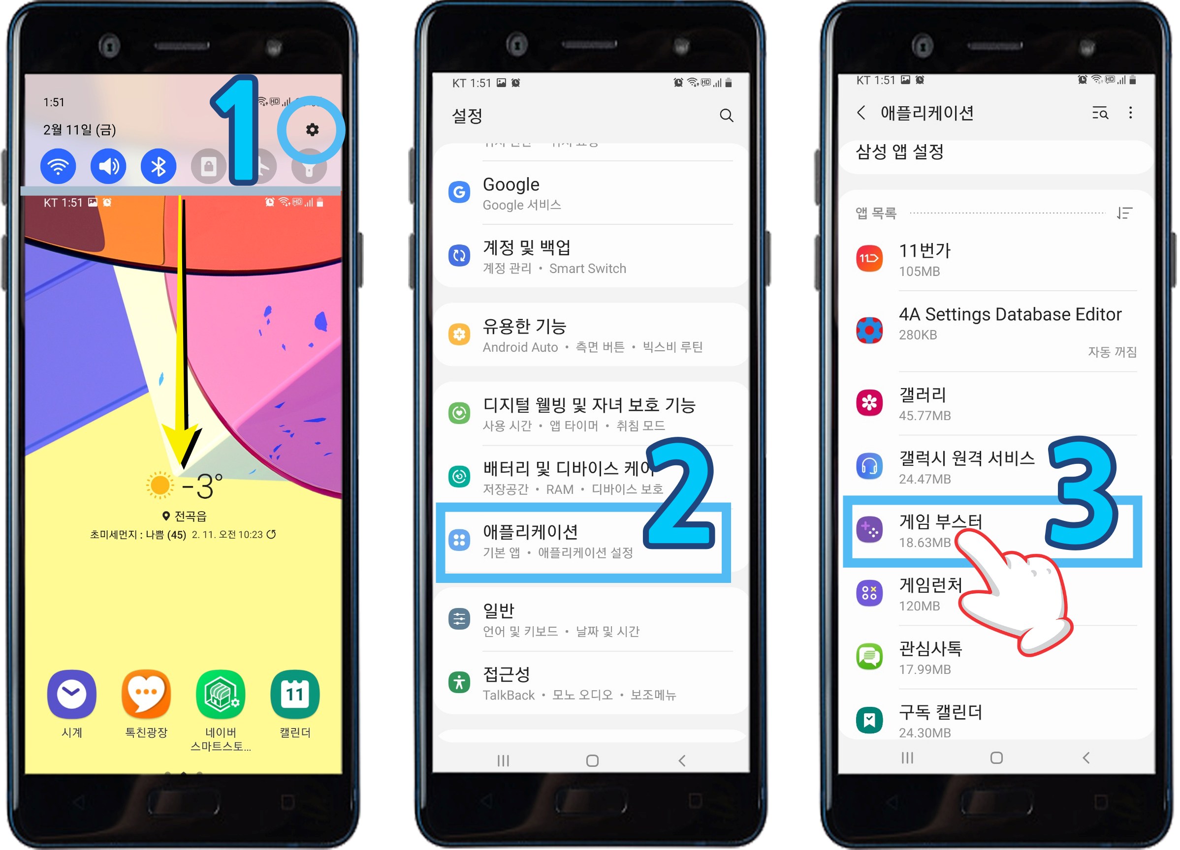 화면을 아래로 내려서 우측 상단 1. 설정 (톱니바퀴) →쭈욱 아래로 내려서 2.애플리케이션 으로 들어가 3. 삭제하고 싶은 앱을 선택 → 4. 저장공간 → 하단 5 데이터 삭제 & 6 캐시 삭제