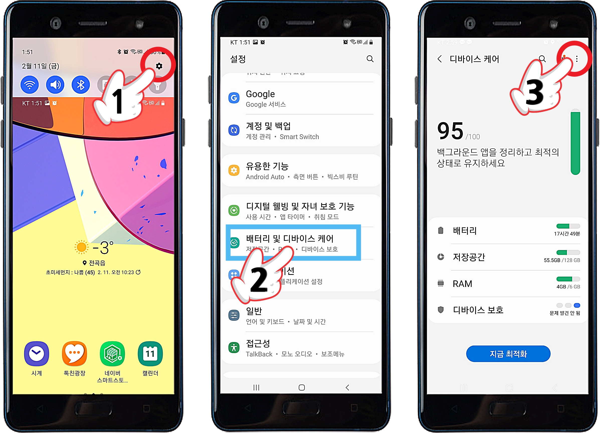 1. 아까와 같이 설정 (톱니바퀴) 클릭 → 이번에는 배터리 및 디바이스 케어 클릭 → 화면이 바뀌면 3번과 같이 우측 상단 점 3개 클릭 → 새로운 작은 창에서 자동으로 케어 클릭