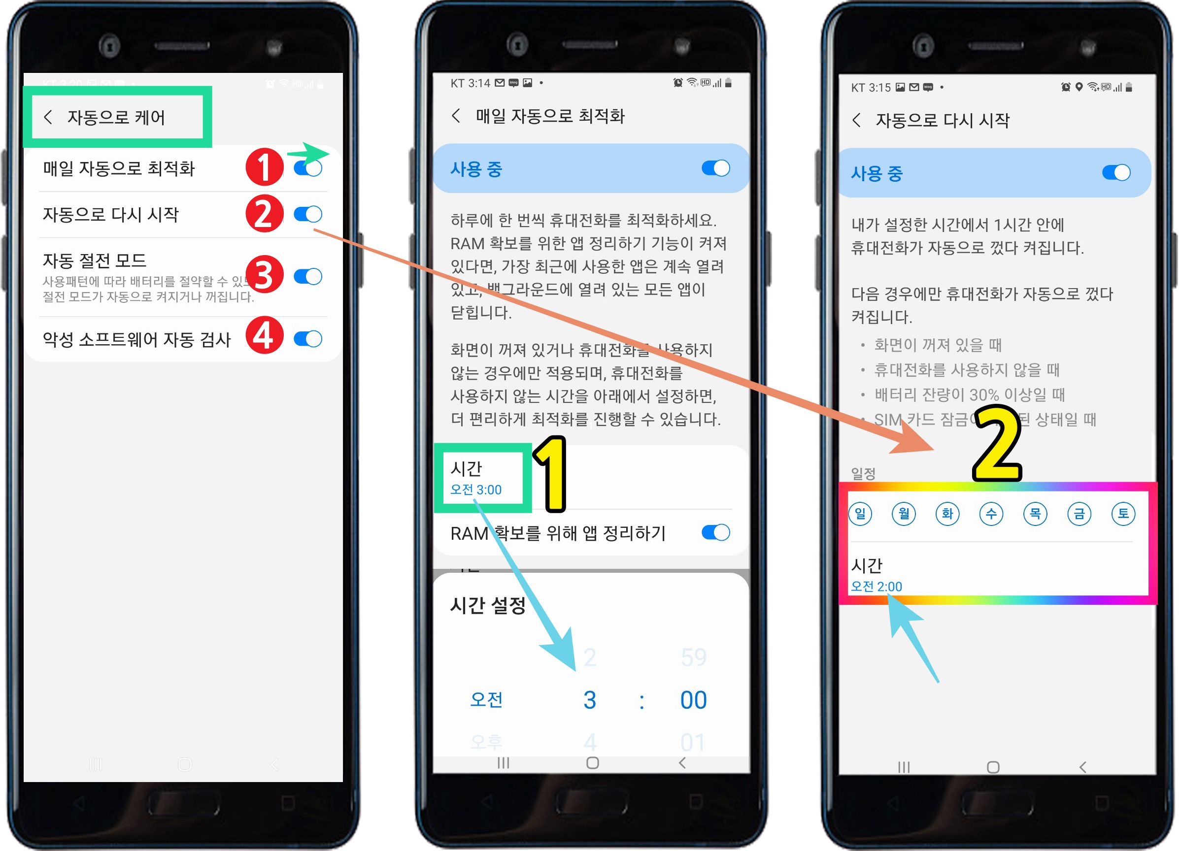 2. 자동으로 다시 시작 → 스마트폰을 거의 끄는 사람이 드물다. 하루에 한 번 자동으로 다시 시작하게 설정해 주는 것이 좋다 → 활성화시킴 → 노란색 2번과 같이 일요일~토요일 동그라미 원을 모두 체크해 주고 하단의 시간을 선택해서 겹치지 않게 설정해 준다.