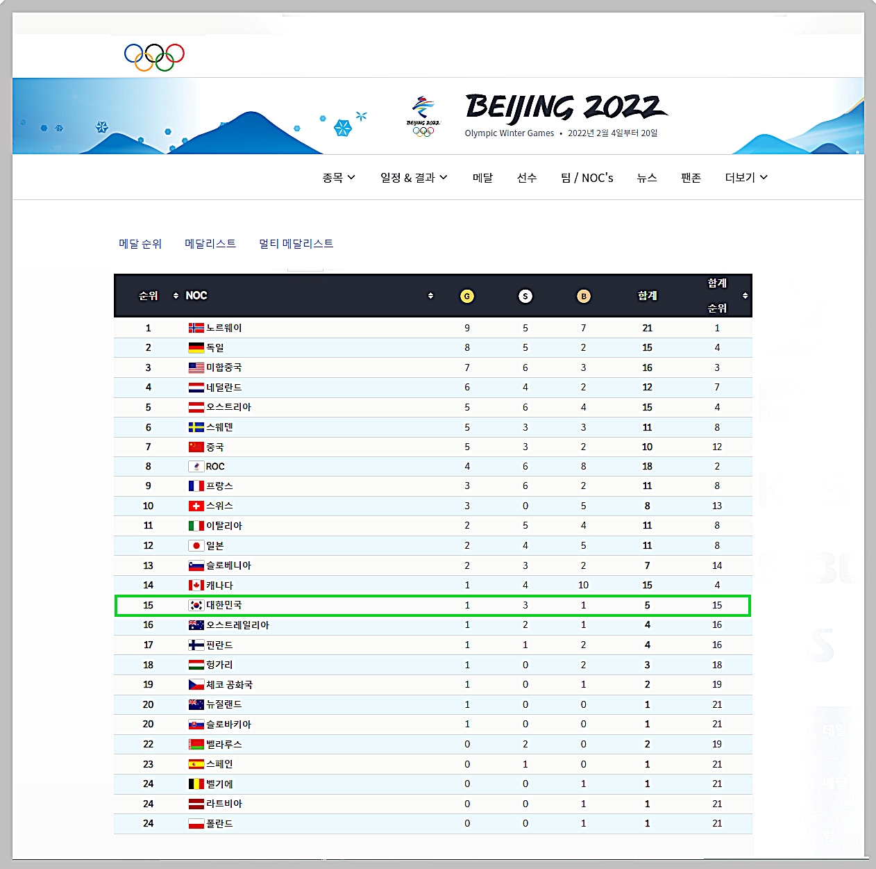 쇼트트랙 여자 대표팀이 은메달을 추가하면서 순위에서 뒤쳐져 있던 한국이 메달 순위(금메달 순)에서 15위로 올라섰다.