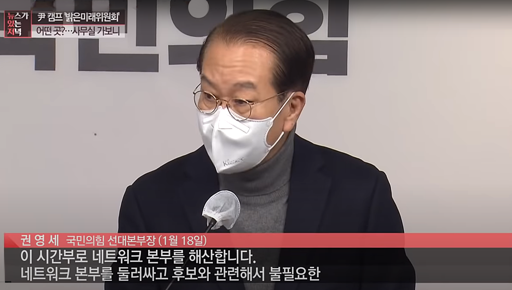 건진 법사 무속인이 국민의힘 윤석열 선거캠프에서 모든 것을 조정을 하고 있다는 소식이 일파만파 커지자 문제의 네트워크 본부를 해체한 다고 국민의힘 권영세 선대본부장은 1월 18일 발표했다.