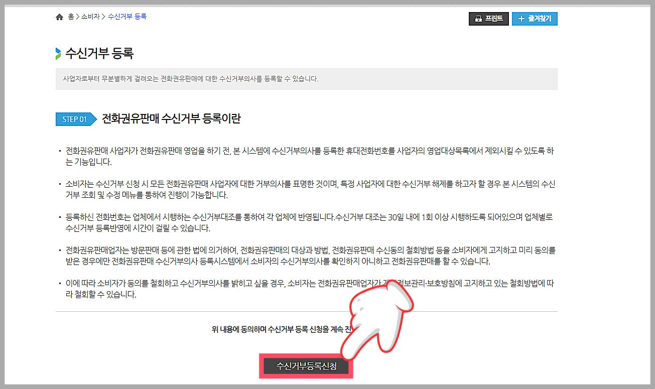 이 시스템에 수신거부의사를 등록하면, 사업자에 대해서는 수신거부의사 확인 및 거부의사를 등록한 소비자에 대한 전화권유 판매 금지 의무를 부과하는 제도'를 말한다.