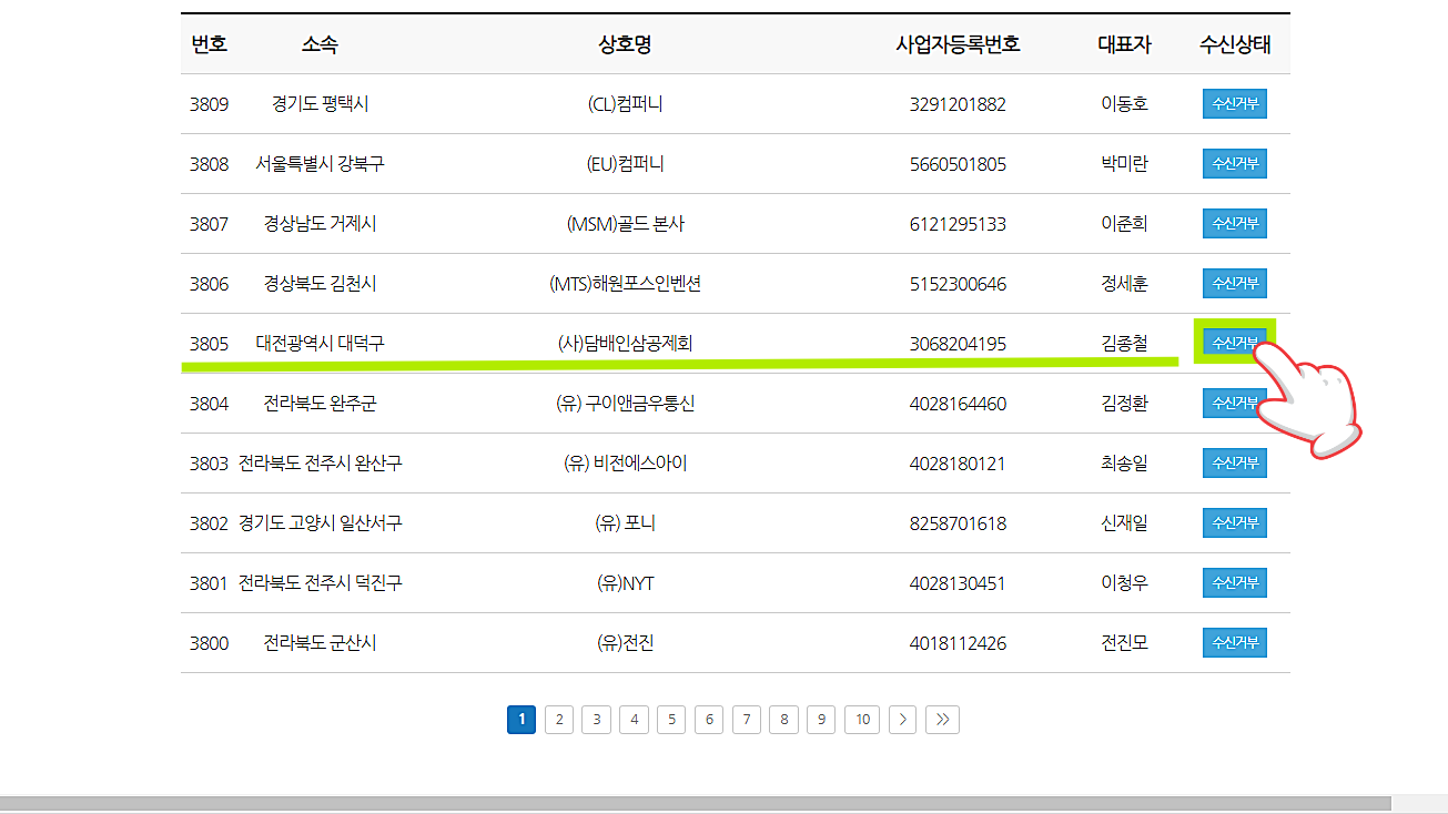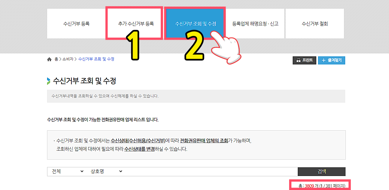만약 내가 수신해야 할 번호가 있을 수 있다. 그런 경우는 2번 수신거부 조회 및 수정을 클릭하면 위와 같이 나타난다.