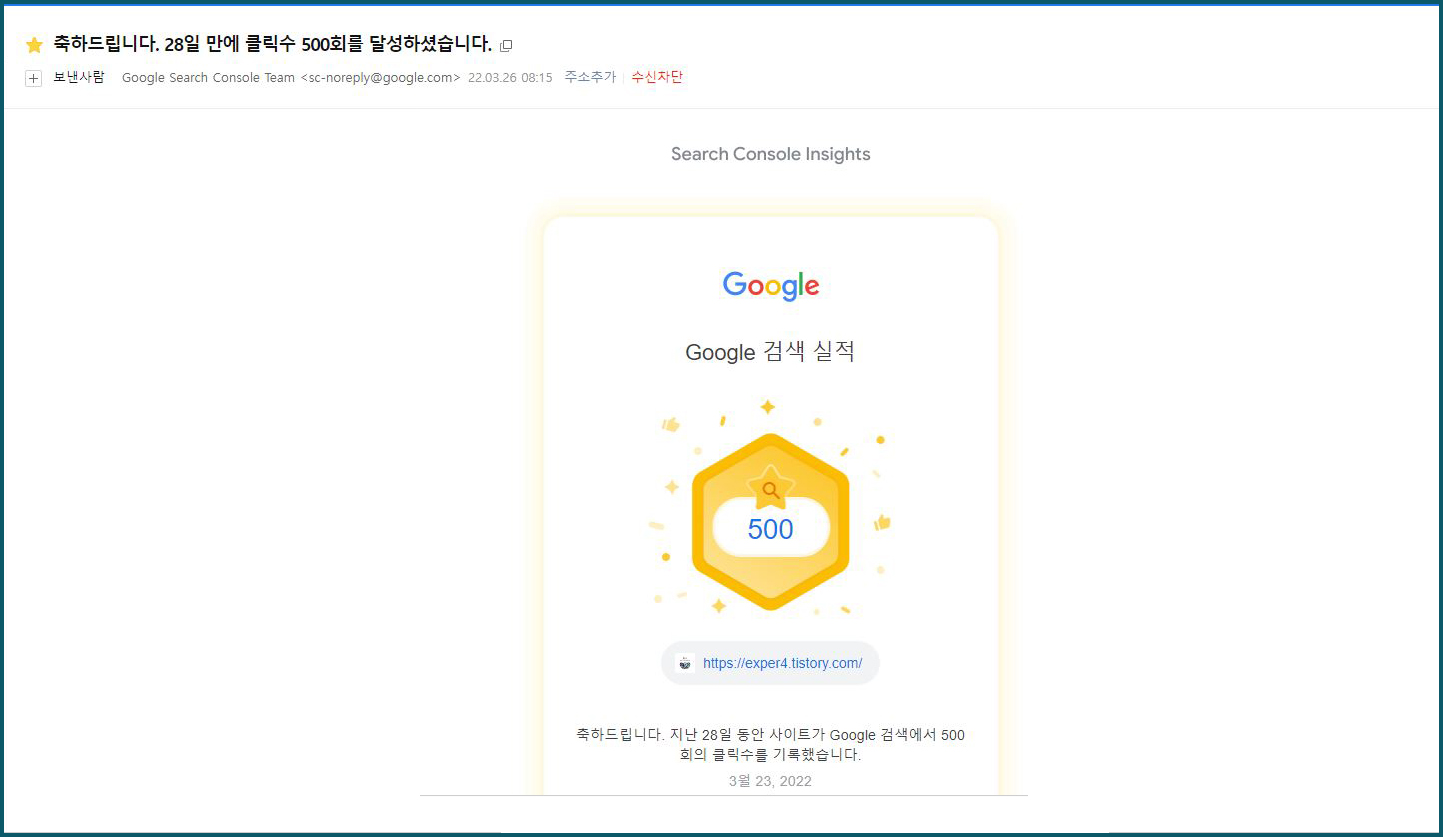 그러다 어느 날부턴가 수익이 점차 늘어나게 되면 구글에서 축하의 메일이 온다.