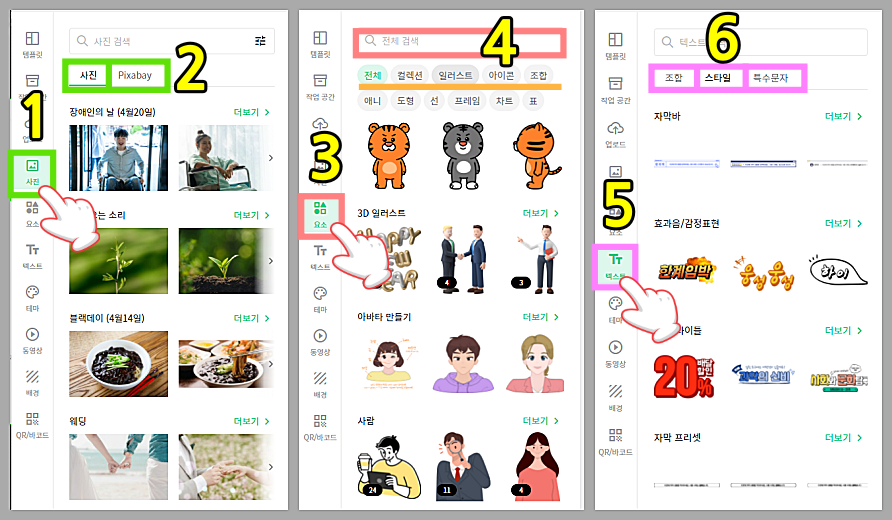 좌측 카테고리에서 1)과 같이 사진을 클릭 → 2) 2개의 설정중 좌측 사진은 내 PC 이미지를 가져오는 것, Pixbay를 선택하면 무료 이미지로 이동하게 됩니다.