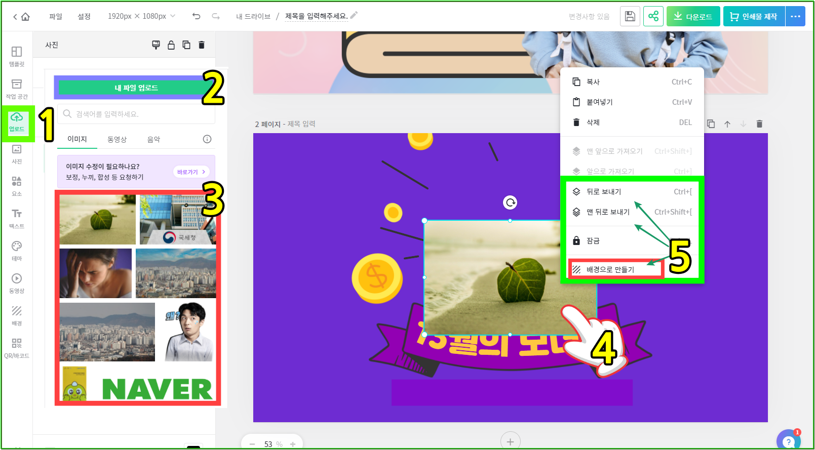 원하는 이미지 클릭 → 우측 바탕화면에 작게 나타남 → 4번과 같이 이미지를 선택하면 5번 창이 나타나 그중에서 배경으로 만들기 선택해주면 자동으로 바탕에 꽉 차게 처리됩니다.