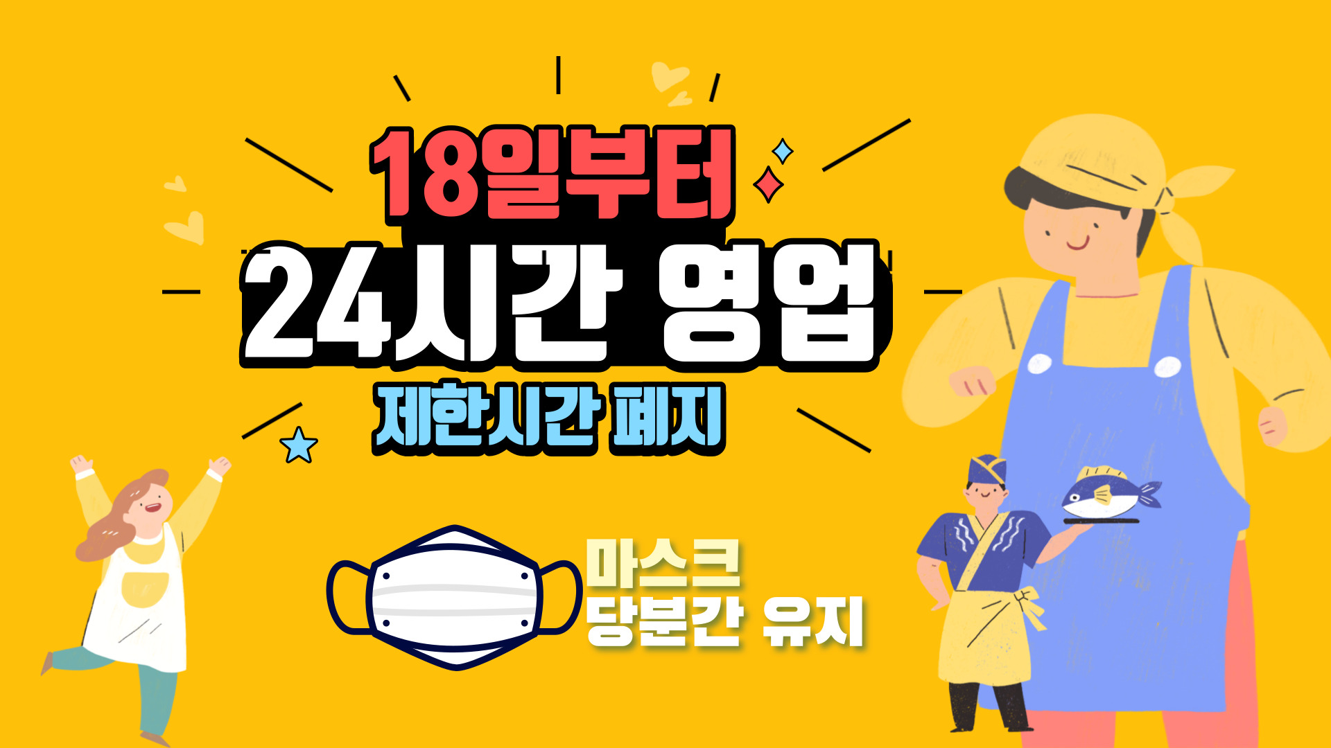 18일(월)부터 그동안 12시까지 다중이용시설 영업시간과 10명까지 허용되던 사적 모임 등이 모두 해제된다.
