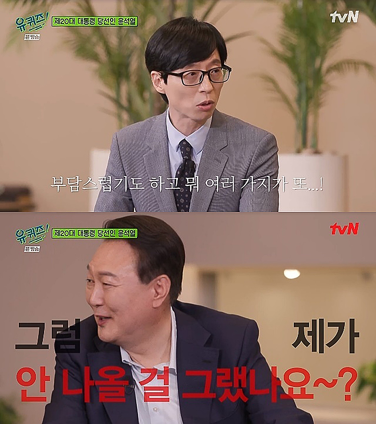 유 퀴즈 언더 블럭 진행자 유재석은 윤 당선인 출연에 대해 진행자의 입장에서는 솔직히 얘기드리면 부담스러운 것이 사실이다"