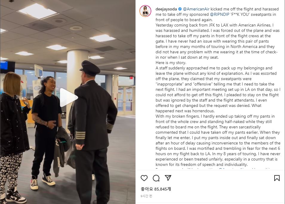 남자 승무원은 비행기 입구 앞에서 DJ소다에게 "바지가 불쾌하다며 다른 비행기를 타라고 했다"고 말했다.