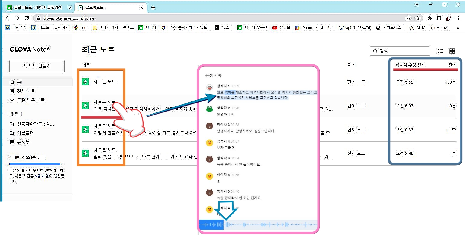 내 pc로 들어가 네이버 검색창에서 클로바 노트를 검색하면 바로 창이 뜬다. → 로그인을 해주면 신기하게도 내가 핸드폰으로 작업했던 내용을 확인이 가능하다.