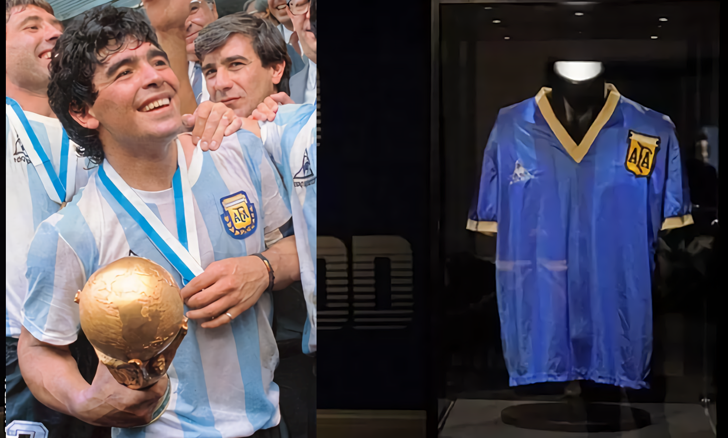 경매에 최고가로 낙찰된 이 유니폼은 1986년 멕시코 월드컵 당시 마라도나가 상대팀 잉글랜드의 미드필더 스티브 호지와 서로 맞교환한 유니폼이다.