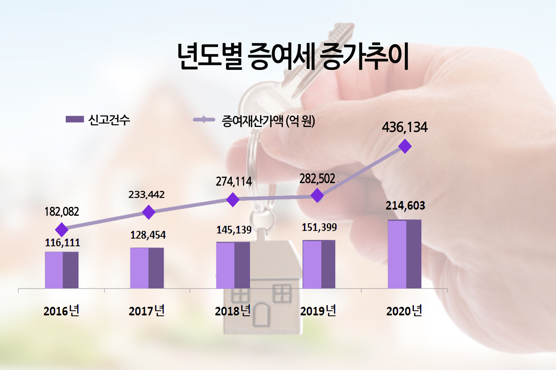 최근 들어 가파른 부동산 가격 인상과 물가 상승에 비해 무상 증여 한도는 그대로이며 그에 따른 세금 부담으로 가족 간 증여를 자제하고 있다는 설명이다.