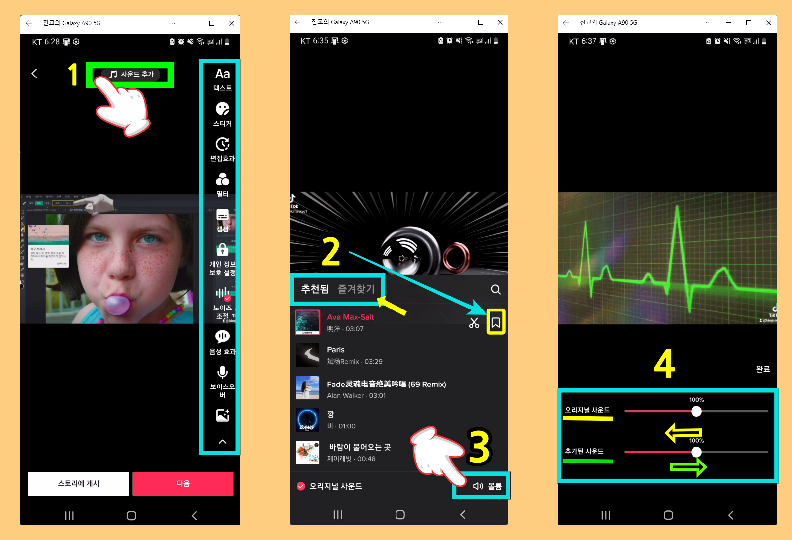 1. 사운드 추가 클릭 (글자나 스티커 필터를 넣어 편집 가능) → 2. 주천됨 (즐겨찾기는 우측 택 - 맘에 드는 음악 저장 후 사용 가능)