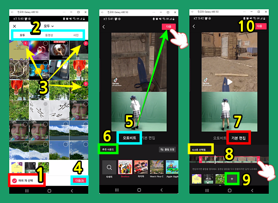 (1) 여러 개 선택 체크 →(2) 동영상 사진 선택 가능 →(3)선택하면 제일 하단에 나타난다 → (4) 다음 클릭 → 오토 비트/ 기본편집 2가지가 나온다