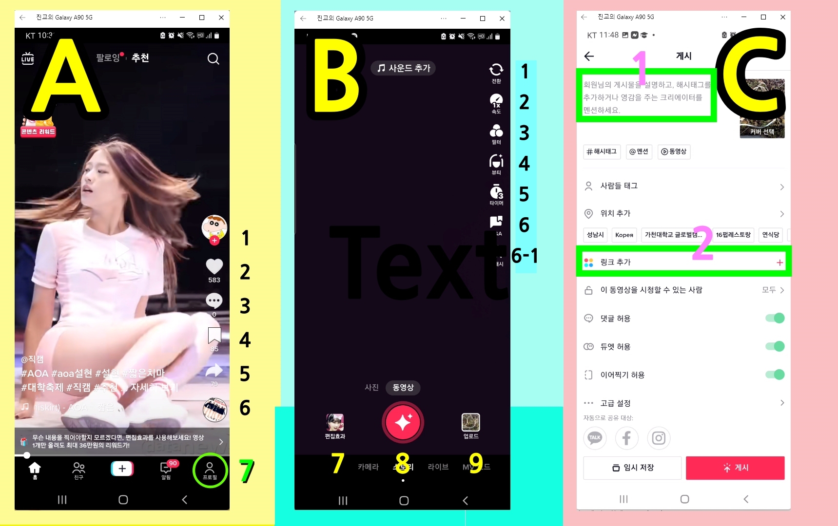 A는 틱톡 첫 화면에서 보이는 화면으로 우측에 6개의 모양이 보인다