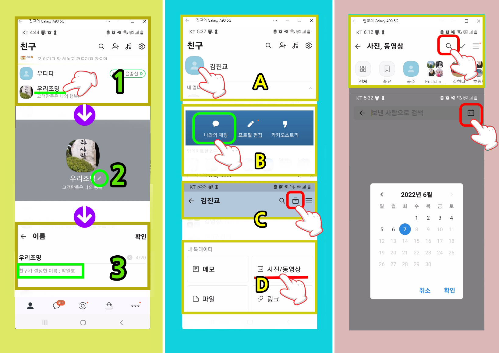 사진까지 보고 싶을 때 카톡 친구 목록에서 A 내 프로필을 클릭 → 좌측 하단 B 나와의 채팅 클릭 → C 우측 상단 돋보기와 삼선 중앙 톡서랍 버튼을