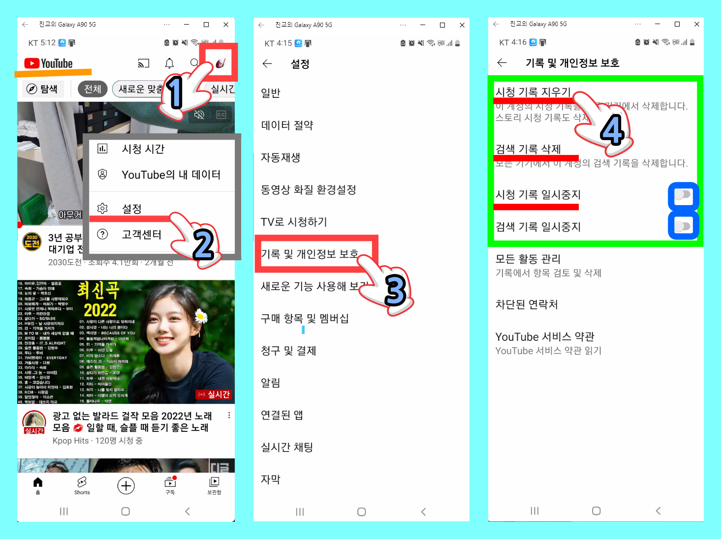 앞으로도 내가 본 유튜브나 검색기록이 남아있는 것을 원치 않는다면 시청기록 일시중지나 검색기록 일시중지를 활성화시켜주면 된다.