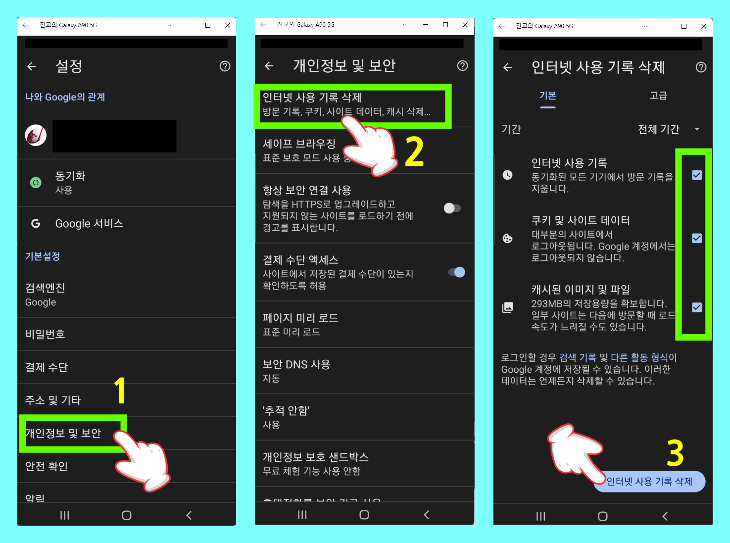 지금까지 사용된 쿠키 및 사이트 데이터 , 캐시 및 이미지 파일을 삭제할 경우 핸드폰이 훨씬 빨라지게 되어 자주 사용하는 것이 속도 향상에 도움 된다.