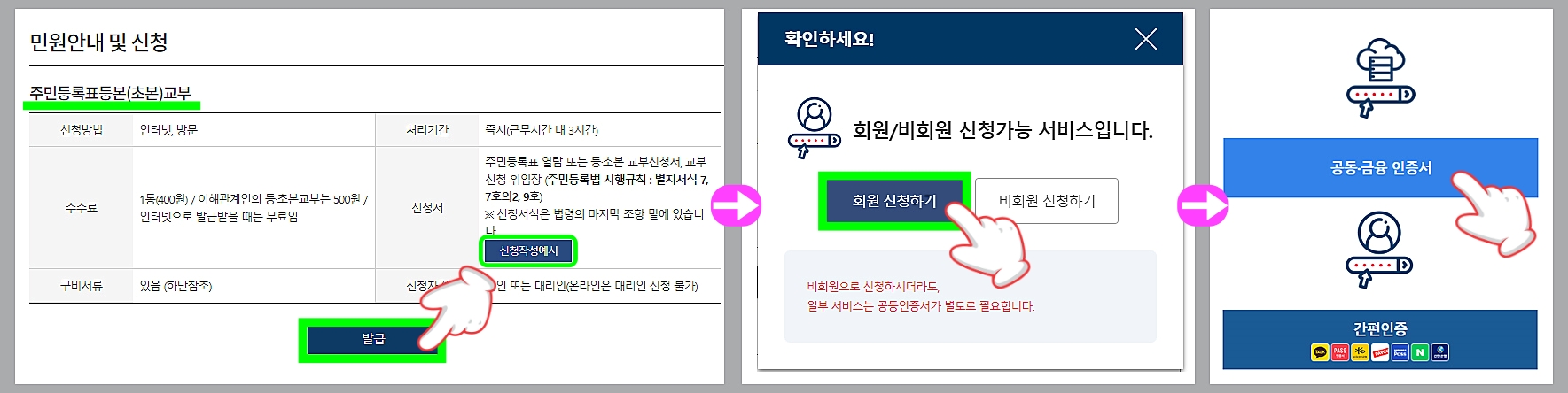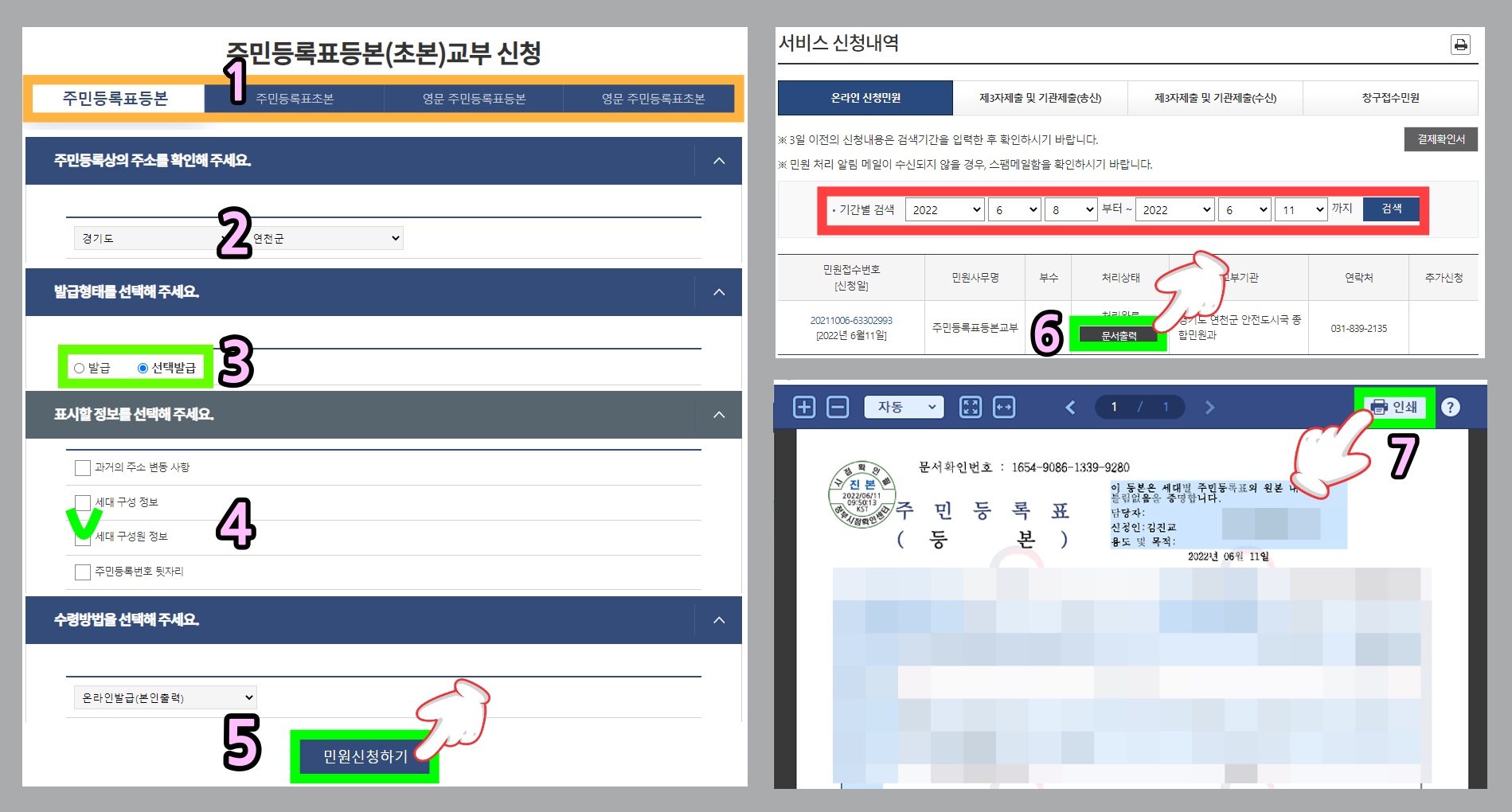 여러 가지 서류 중에서 주민등록 초본이나 등본을 신청해 볼게요.
