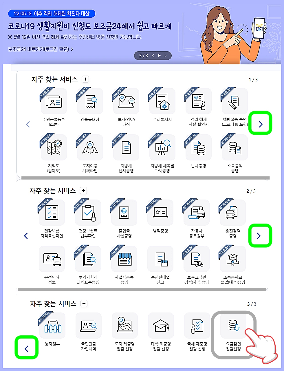 정부 24시 홈페이에서 검색어로 입력해서 찾으시거나 위의 사진처럼 우측 화살표를 클릭하시고 원하는 민원서류를 클릭만 해주세요.