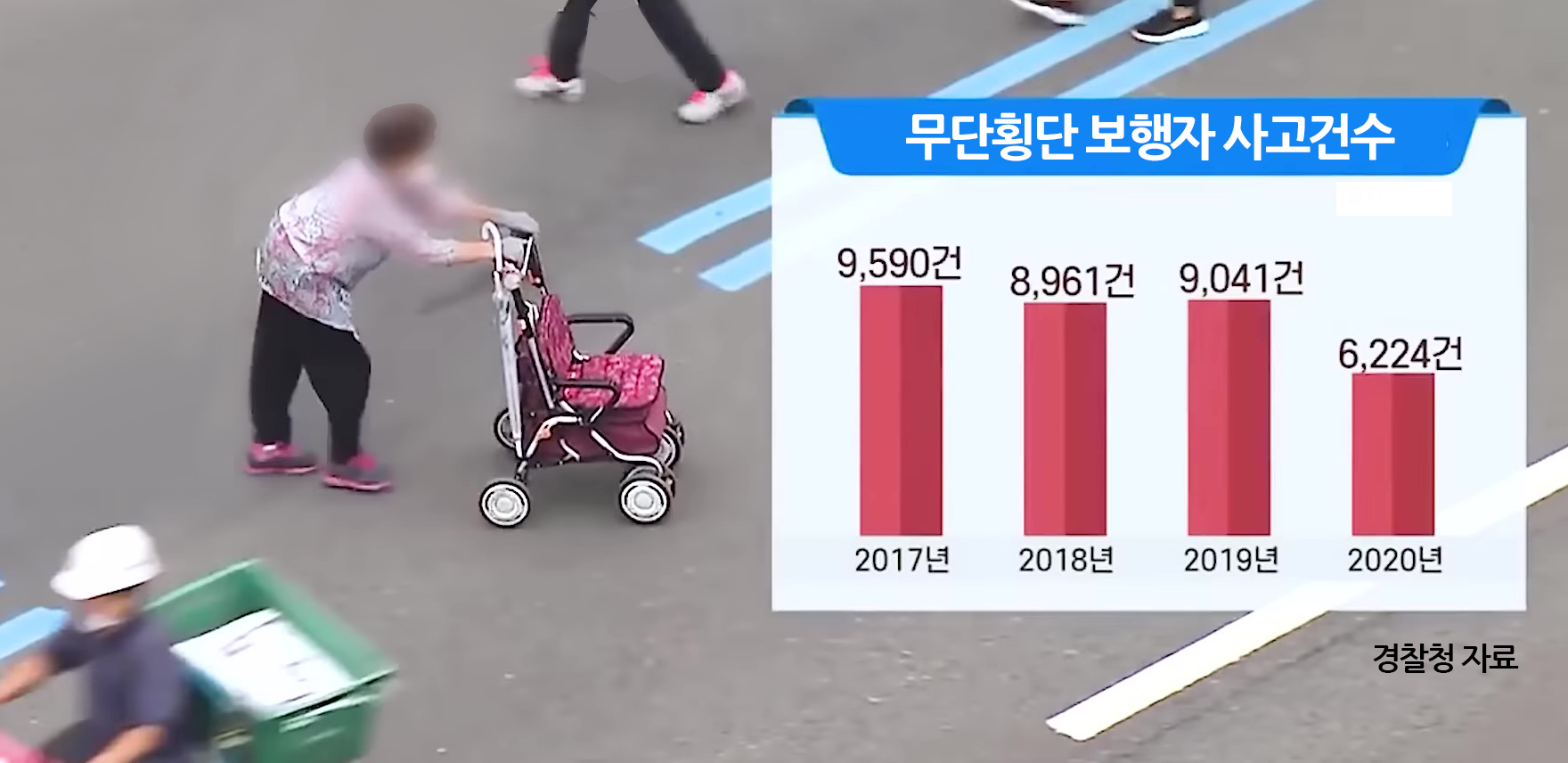 경찰철에서 발표한 자료에 따르면 2017년 9590건, 2018년 8961건, 2019년 9041건으로 무단횡단으로 인한 교통 사고율이 매우 높다.