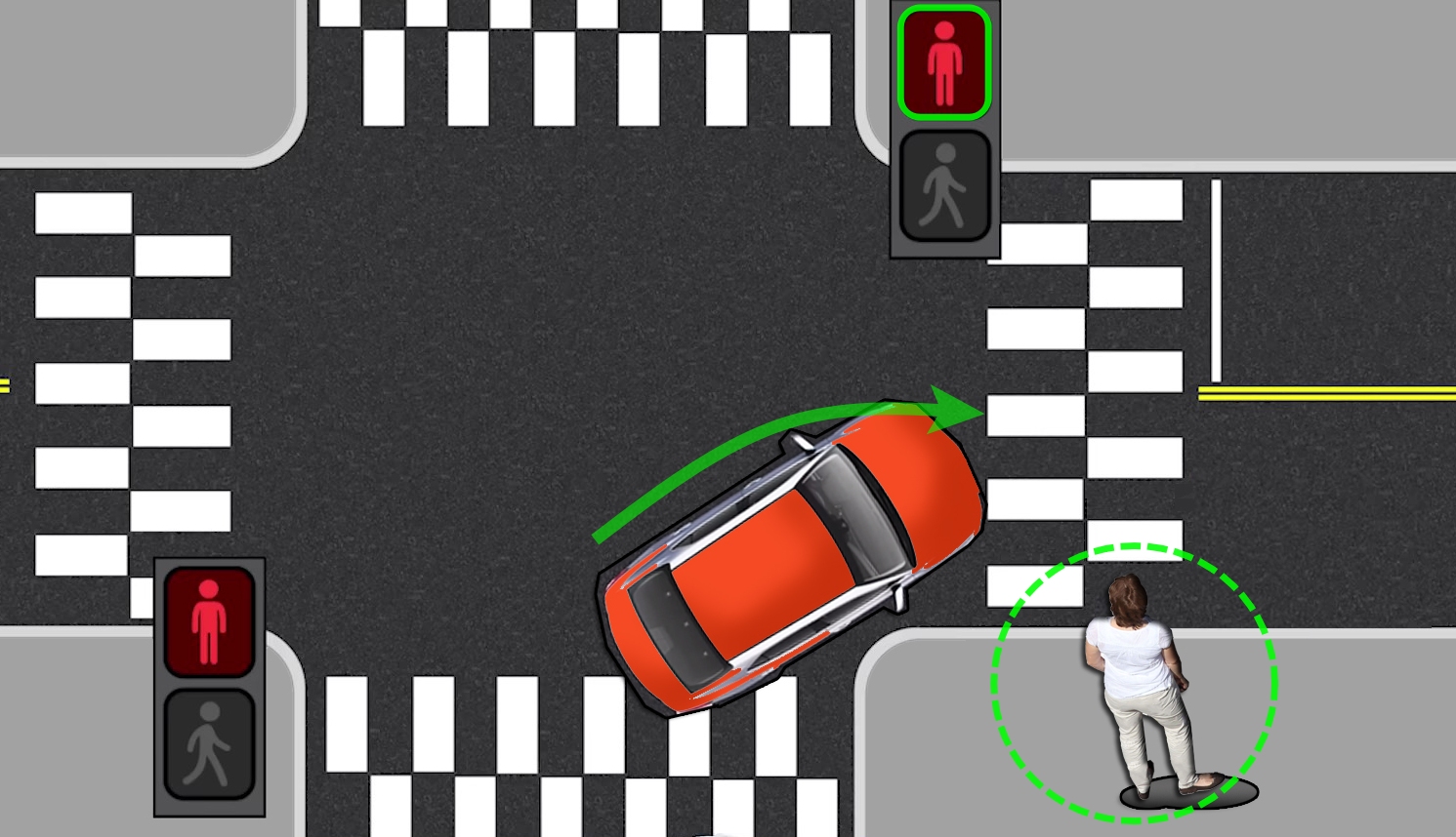 사거리 교차로 에서 횡단보도를 진입시 보행자 신호등이 녹색 불인 경우 횡단보도에 보행자가 없는경우도 적색으로 바뀔 때까지 반드시 멈추어야 한다. (신호위반)