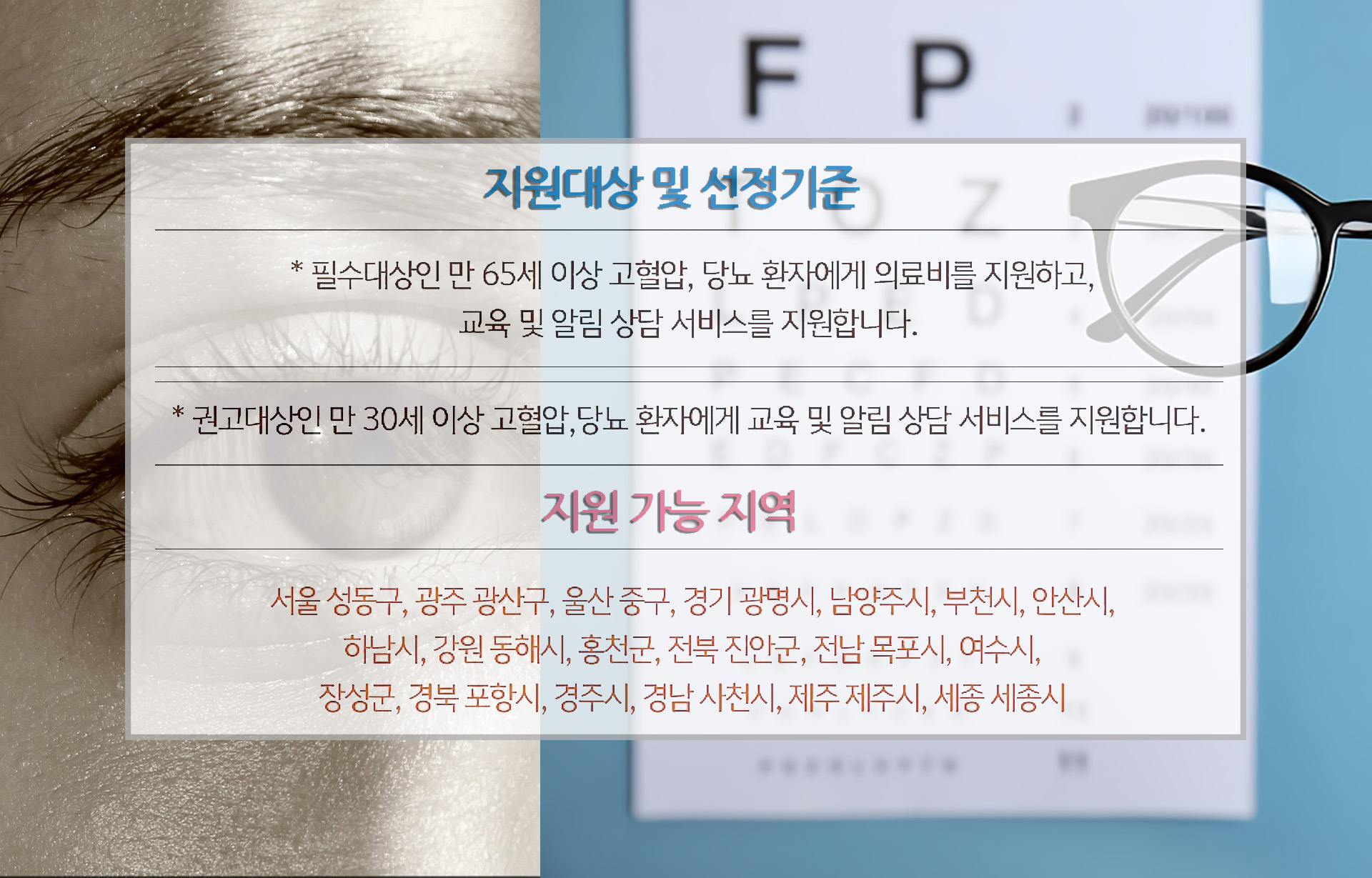 검사비는 무료로 또는 보건소에서 1인당 1만 원 이내로 1년에 한 번 저렴한 금액으로 안저(눈) 검사를 받을 수 있다