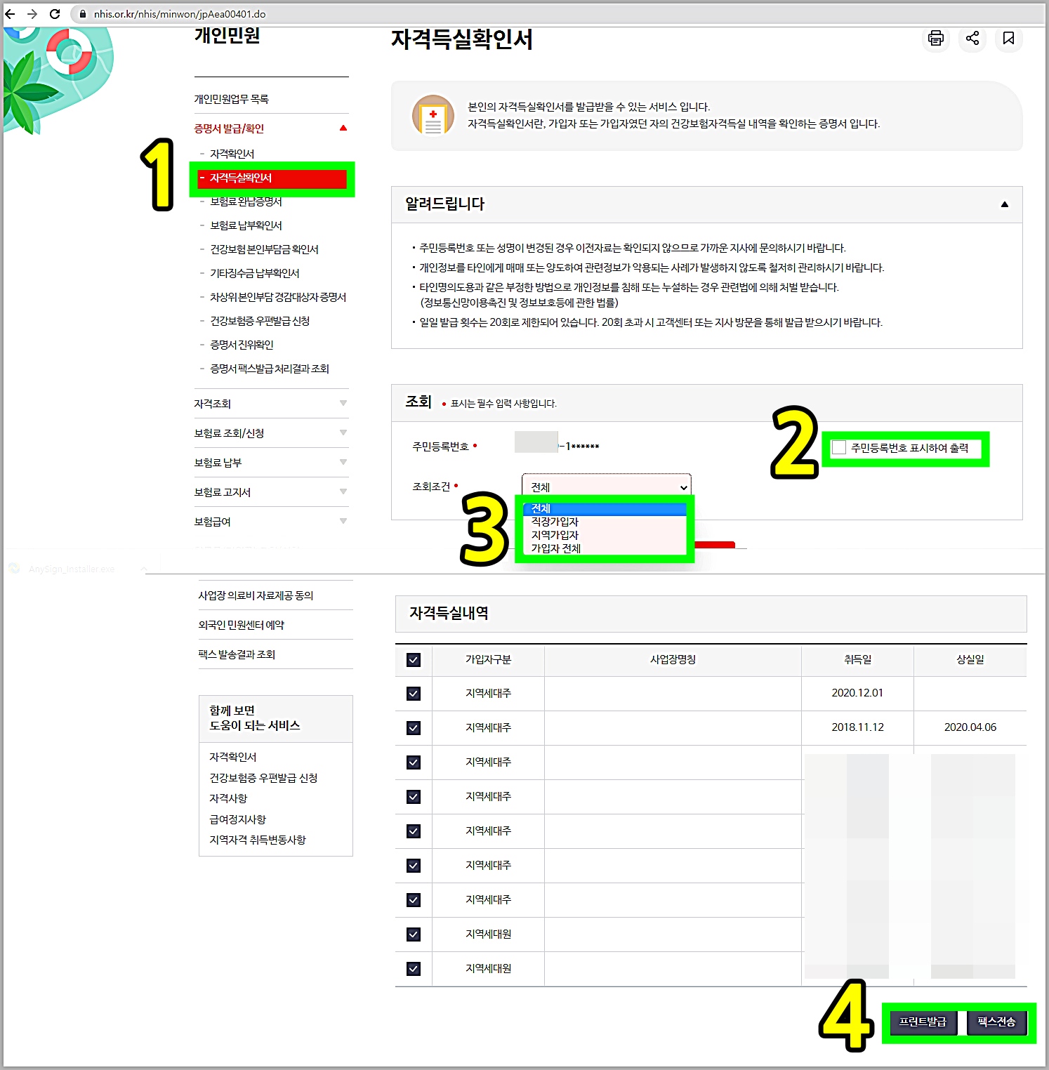 3. 조회조건 3가지 → 직장가입/ 지역가입/ 가입자 전체 중 원하는 내용 선택  → 조회 클릭   하단에 원하는 내역 표시됨