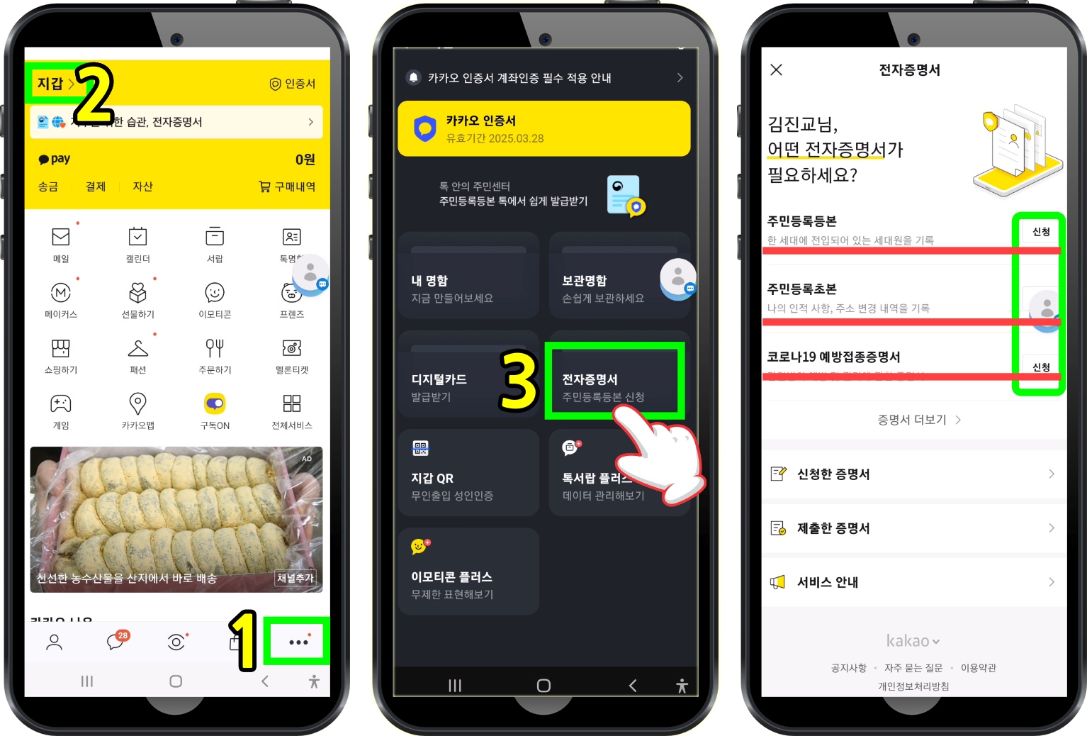 지갑 클릭 → 전자증명서 클릭 → 전자증명서 시작하기 클릭 → 약관 전체 동의 → 하단 동의 후 인증하기 클릭 → 6자리 비밀번호 입력 (카톡 지갑 설정 시 비밀번호 잊지 말 것)