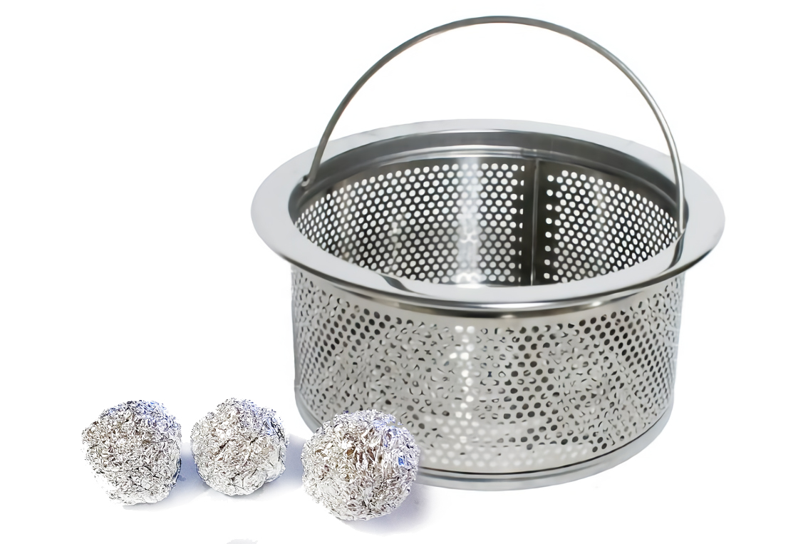 세균억제 효과까지 있는 쿠킹 호일이 공처럼 말아져 물이 배수구 거름망을 통과할 때마다 굴러다니며 자동으로 세척해주는 역할을 한다.