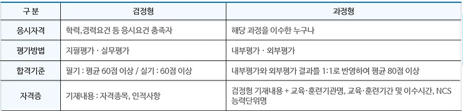 과정 평가형은 교육 훈련을 받는동안 내부평가와 외부평가를 통해 그 능력을 인정받게 되면 자격증을 인정받게 된다.