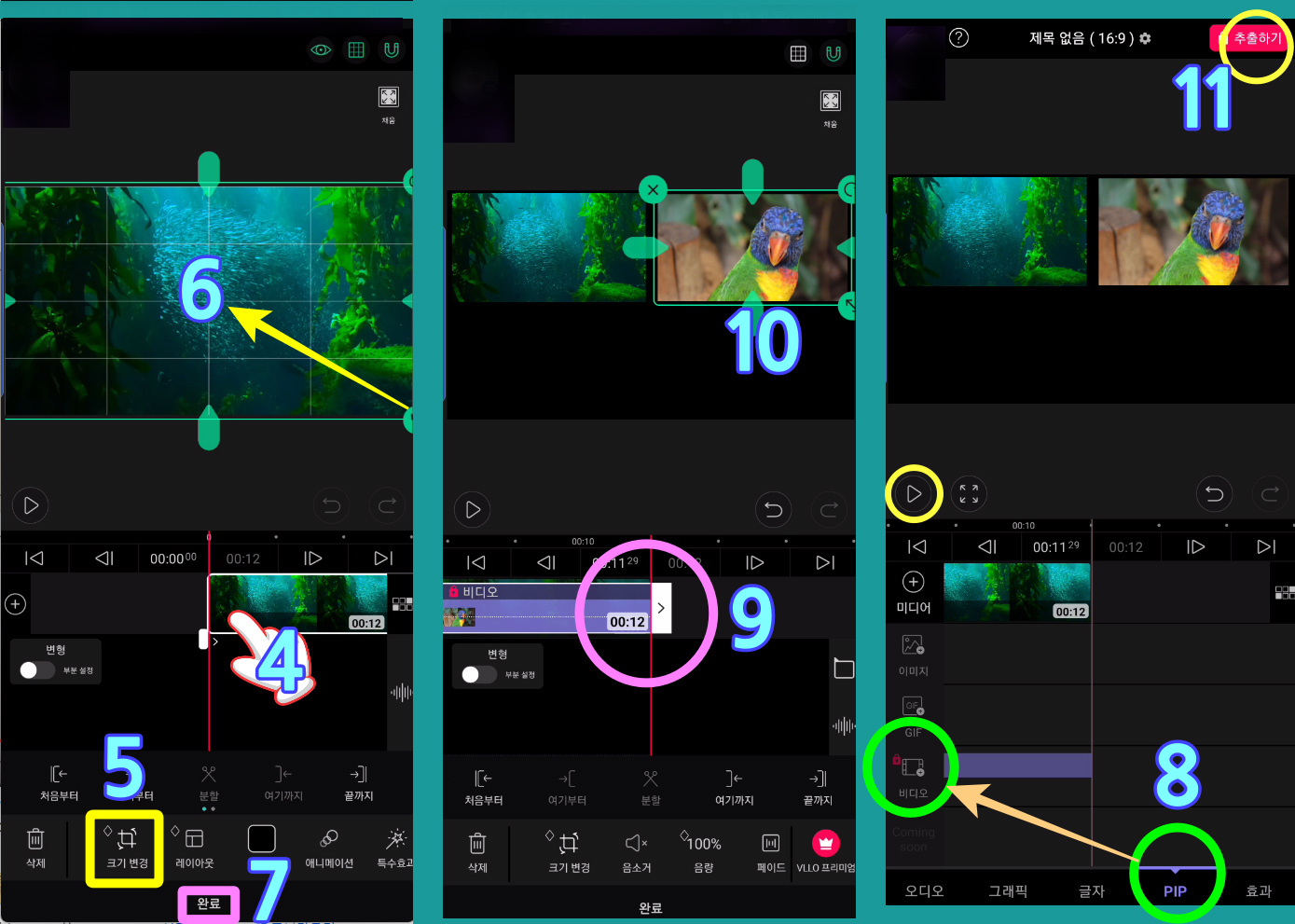 처음 영상을 먼저 가져와 올려놓은 다음 → 아래 영상은 PIP → 비디오 → 하단 영상을 탭 해준 후 영상을 불러온다.