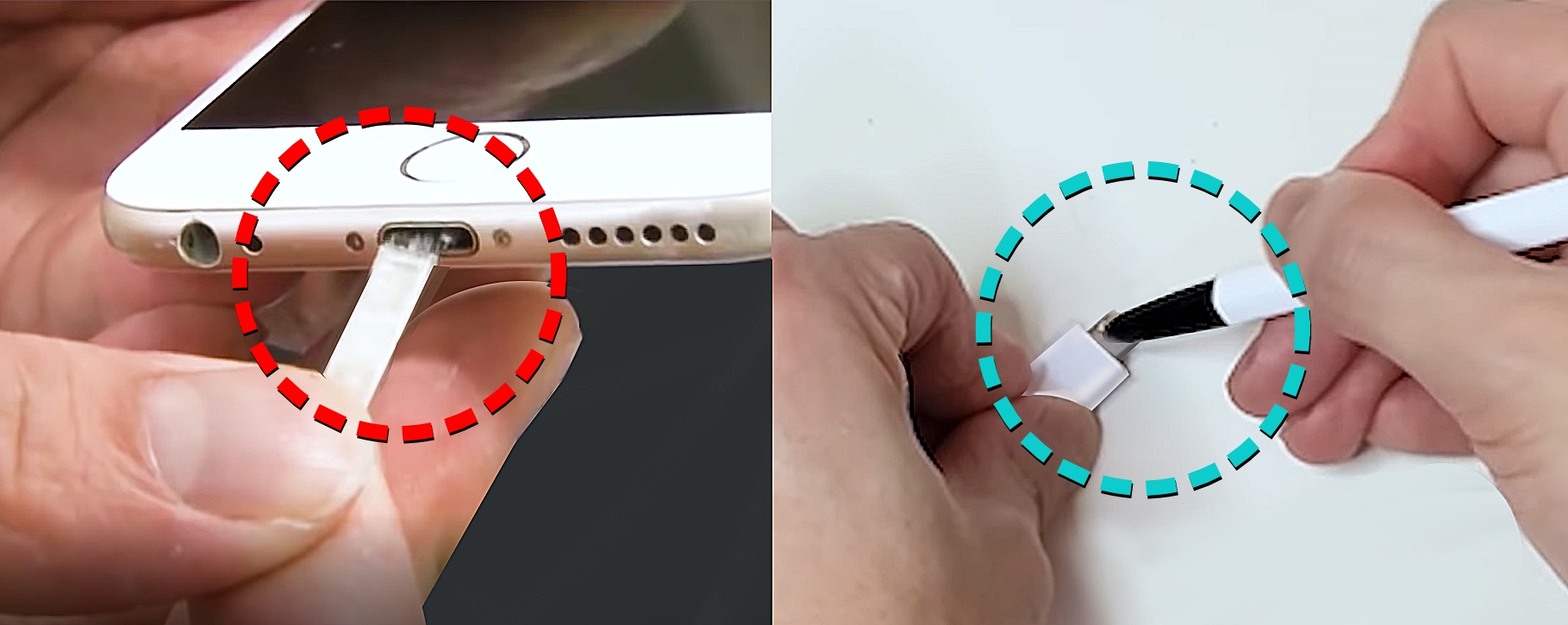 휴대폰을 주머니에 넣고 다니는 경우 먼지가 휴대폰 충전 부분 안으로 들어가는 경우 그대로 충전기를 꽂아 사용하다 보면 안에 먼지가 누적되어 접촉이 잘 안 되는 경우이다.