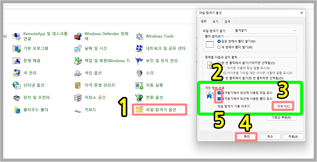 1.(우측 옵션 큰 이미지로 보기 클릭) → 파일 탐색기 옵션 클릭 →