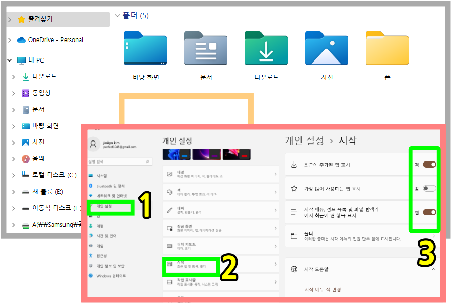 내 PC 설정 → 1. 개인설정 →2. 시작 클릭