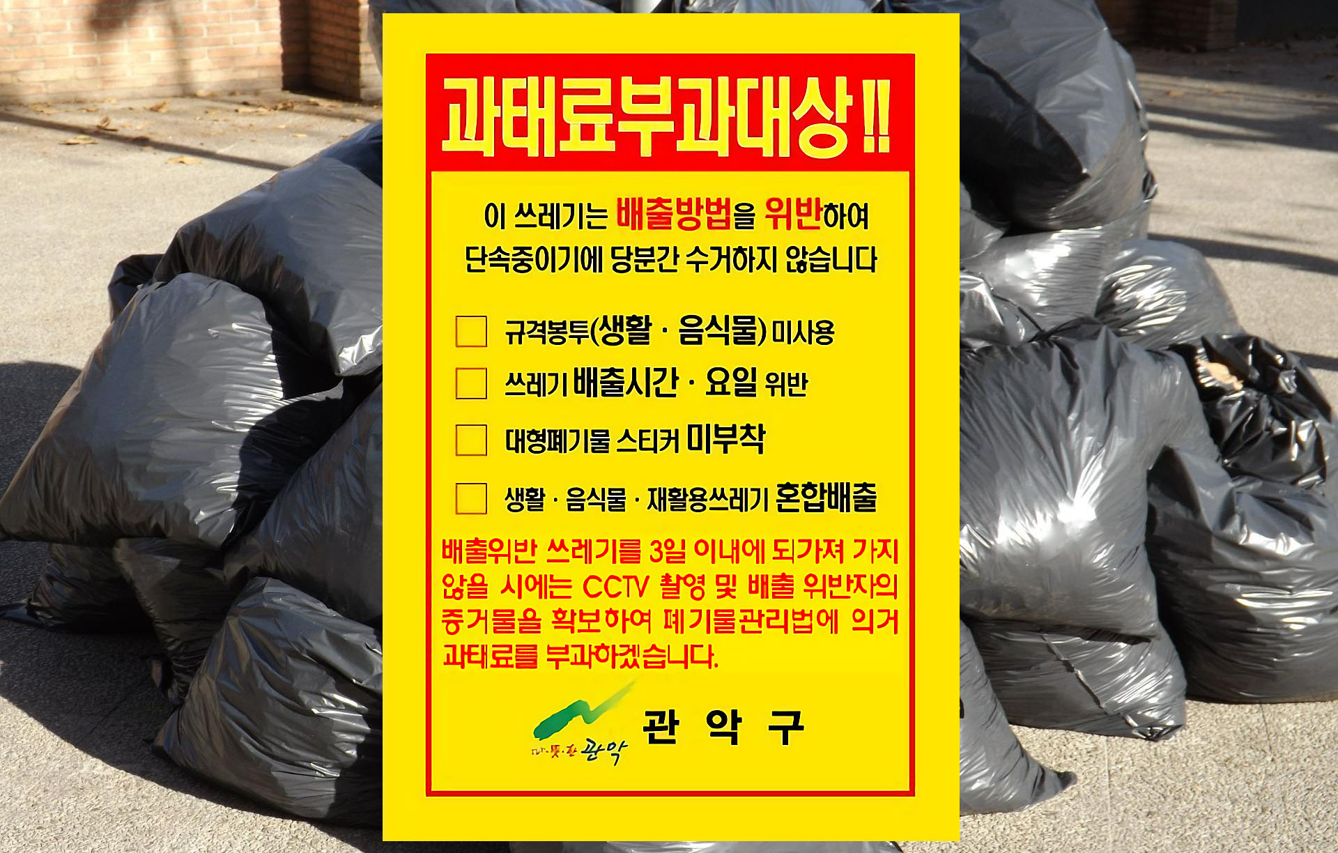 2. 지정된 시간과 장소,지정된 요일을 지키지 않거나 쓰레기를 아무 곳에 버리고 불에 태우는 행위도 적발되면 바로 과태료 대상이다.