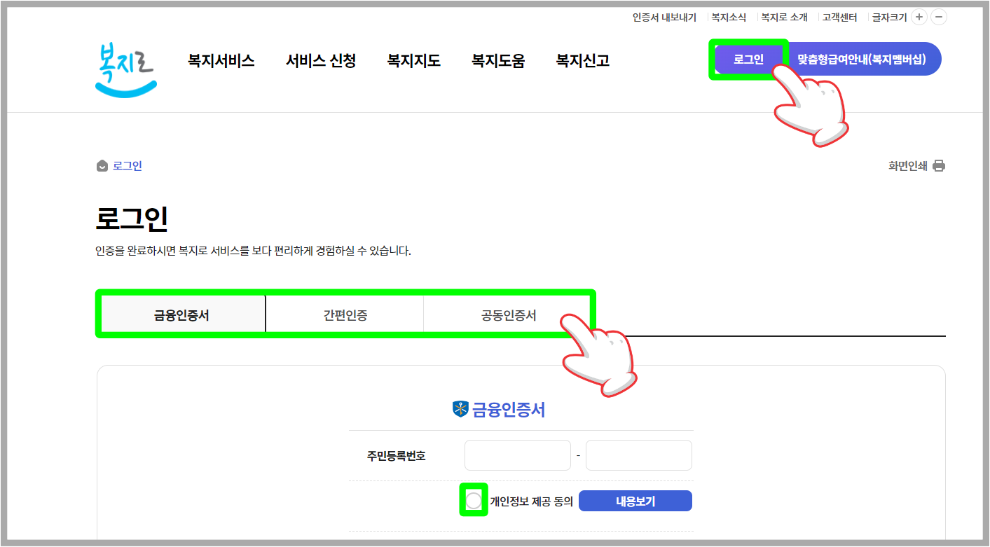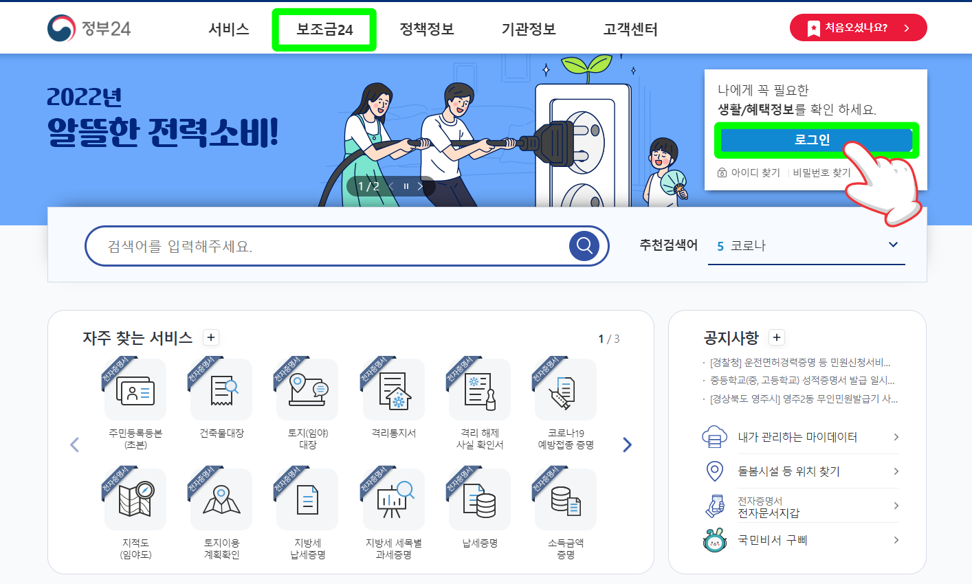 먼저 검색창에 보조금 24라고 검색 → 로그인 클릭→본인이 편한 간편 인증이나 공인인증으로 로그인 →보조금 24 이용동의 체크