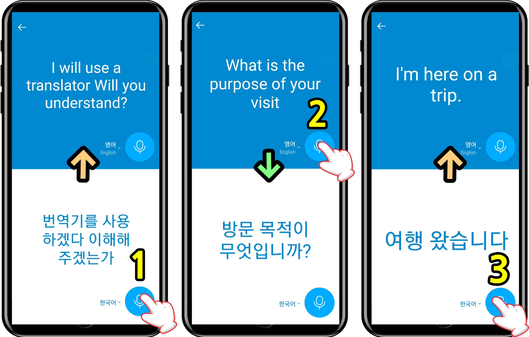 공항 담당자가 하는 말을 녹음하면 바로 한글로 번역이 된다. →답변할 때는 반대로 한글로 놓고 마이크를 선택→ 말하면 영어로 번역이 된다.