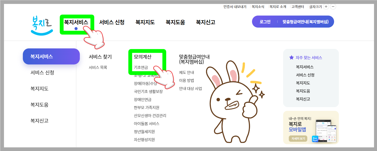 실제 나의 모든 재산상황을 적용해 보려면 복지로 홈페이지에서 복지 서비스 모의 계산→ 기초연금에서 계산해 보면 정확히 수령금액을 확인해 볼 수 있다.