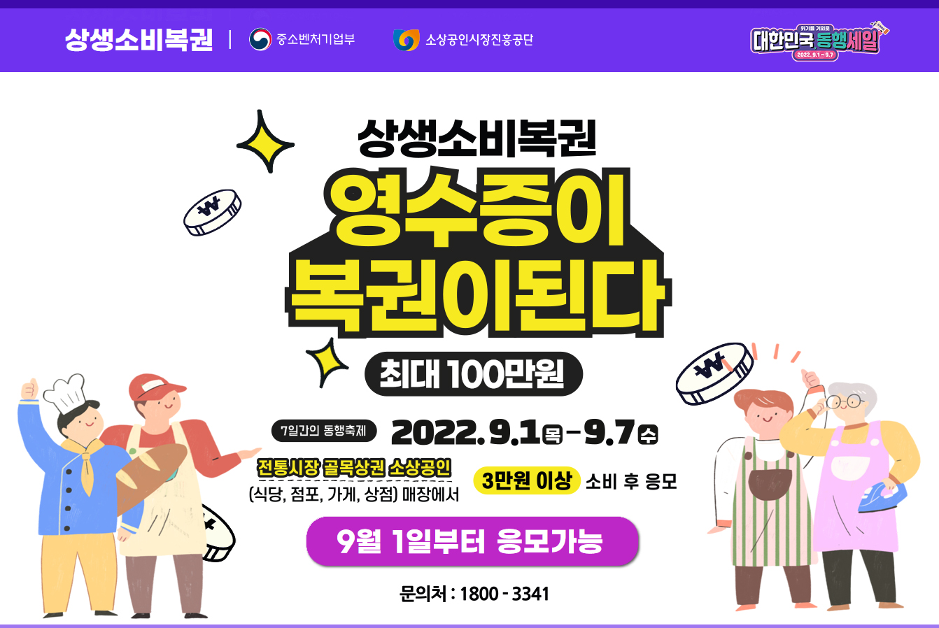이제 9월 1일부터 7일까지 영수증을 꼭 받아두자. 평소 무심결에 버렸던 영수증이 복권으로 바뀌어 100만원 행운의 주인공이 될 수 있다
