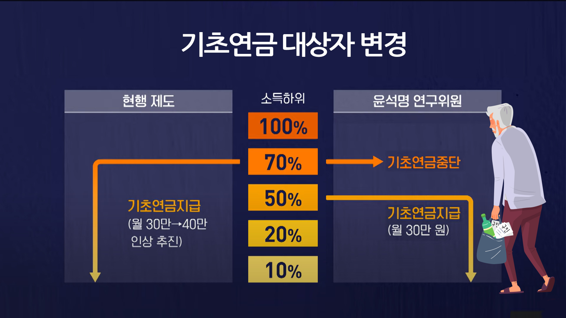 30만 원의 기초연금자는 40만 원으로 인상되지만 국민연금 연계 감액제도는 미세하게라도 감액해서 낮추겠다는 제안이었다.