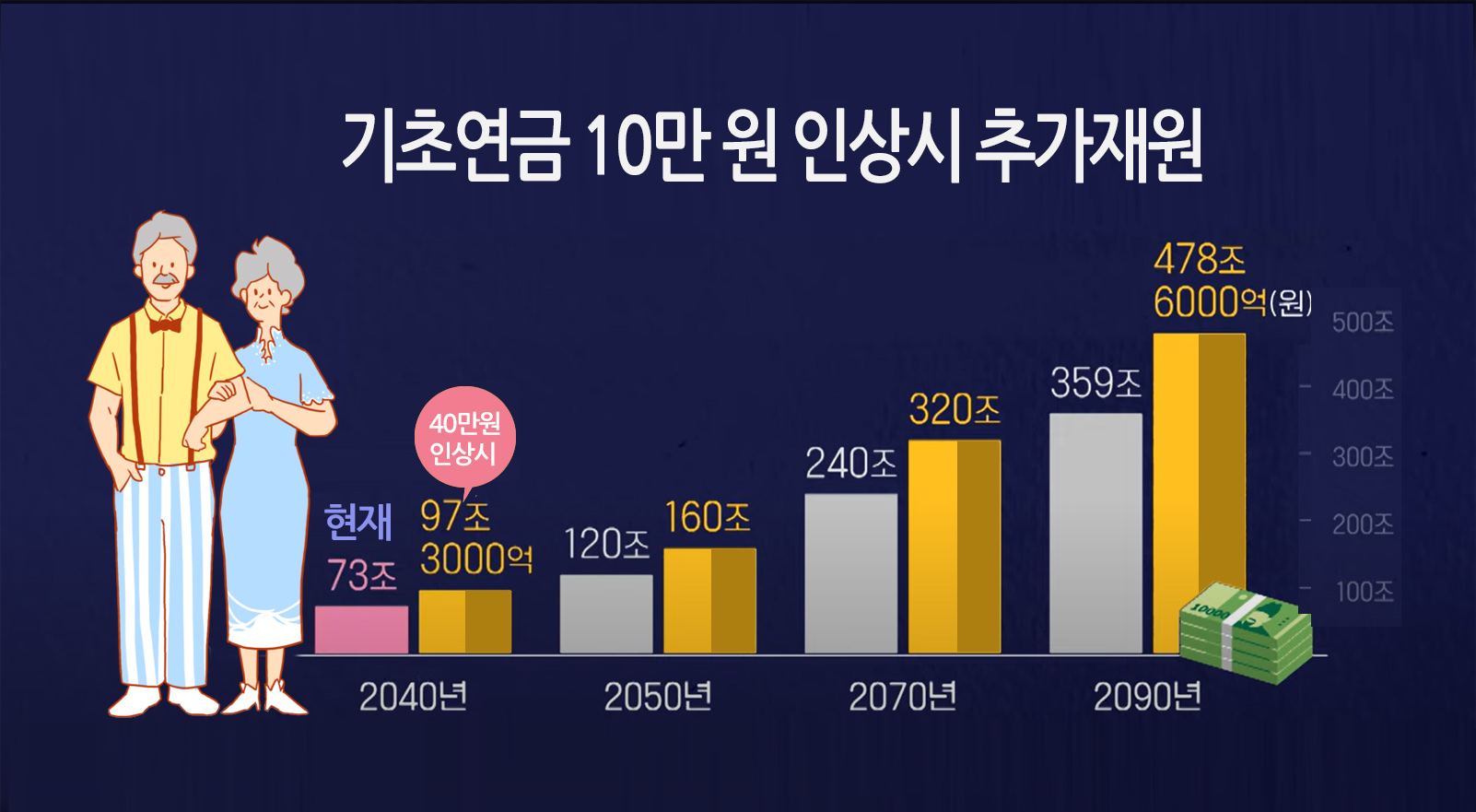 앞서 거론한 바와 같이 40만 원으로 인상 지불에 따른 재원 소모는 2030년에 무려 100조 원이 필요한 재원을 충당키 어렵다는 점이다,