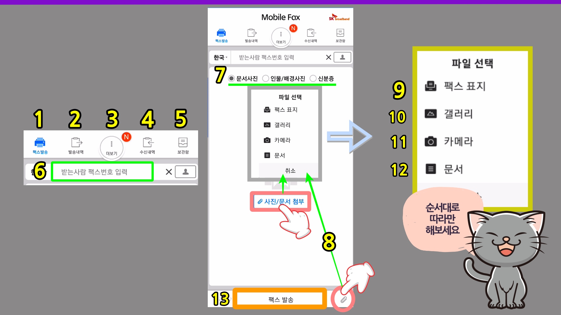 10. 내 갤러리창에서 보내고자 하는 문서나 사진을 미리 촬영해 두었다가 선택해 주면 발송 가능하다,